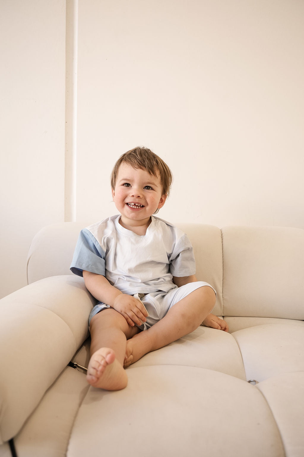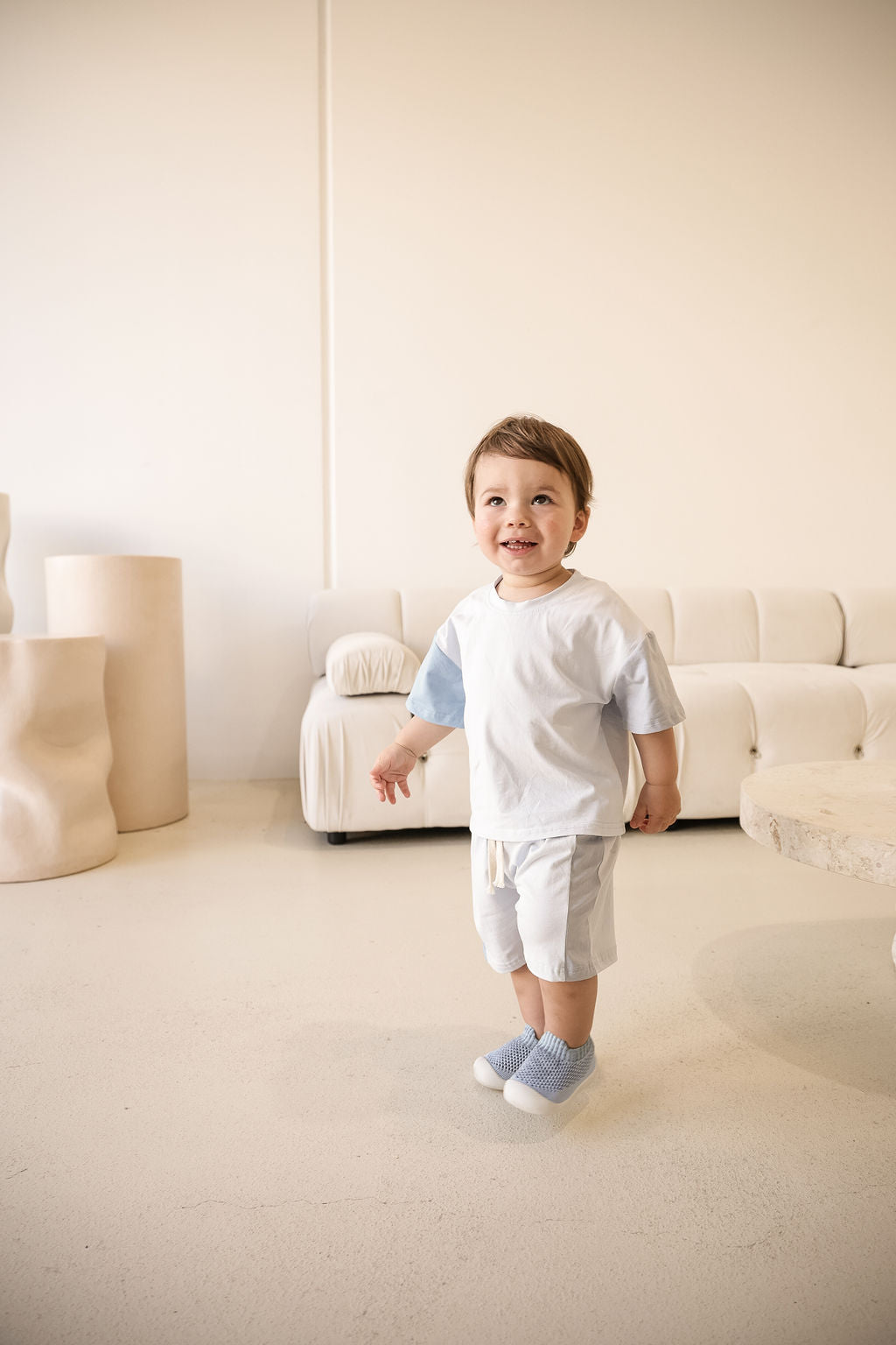 This playful outfit is perfect for active little ones. The soft, breathable fabric ensures all-day comfort, while the vibrant blue colour adds a fun pop to their wardrobe. The set features trendy two-tone block colours of blue, adding a stylish twist, while the elastic waistband on the shorts provides easy on-and-off for busy parents.