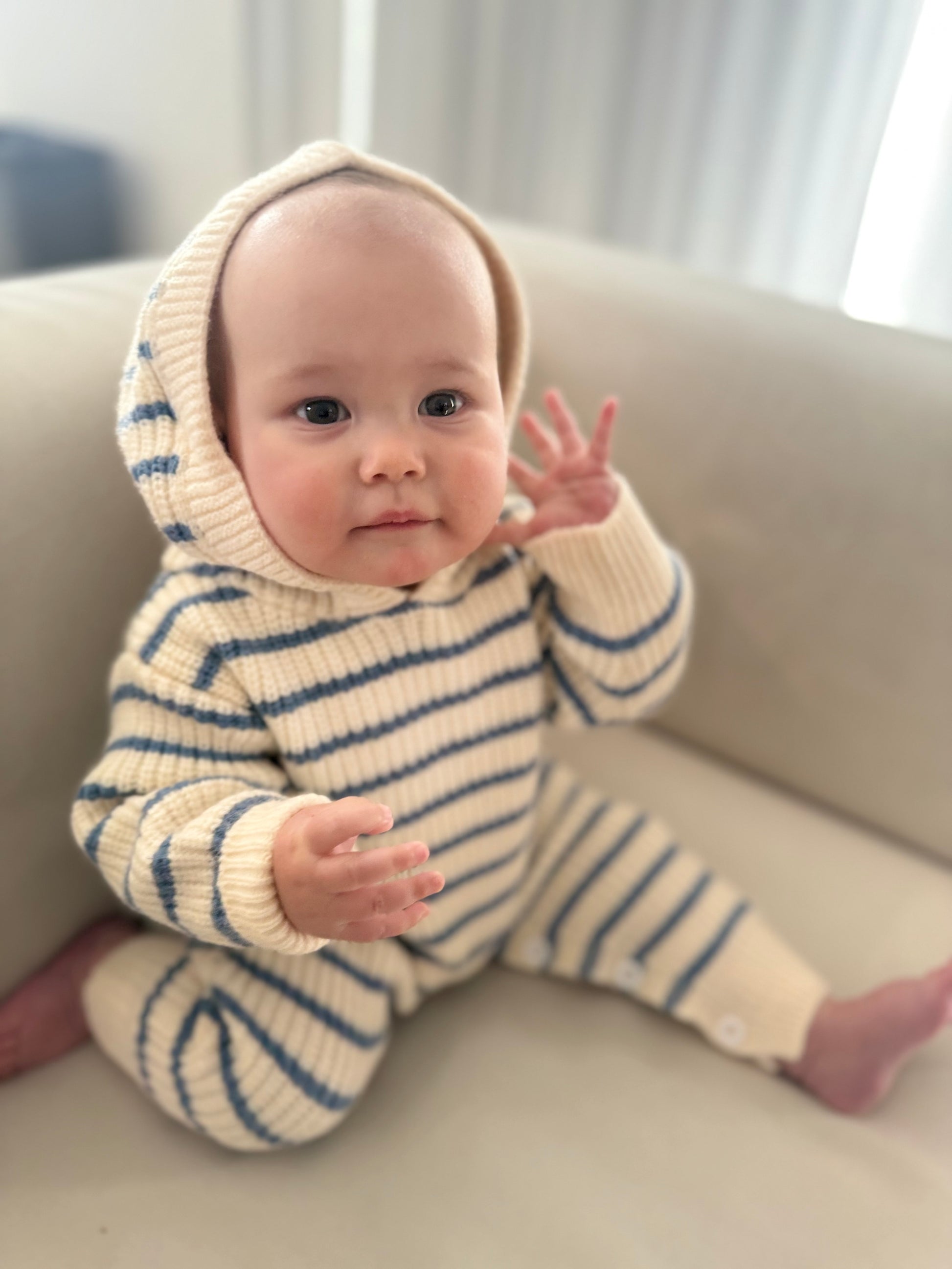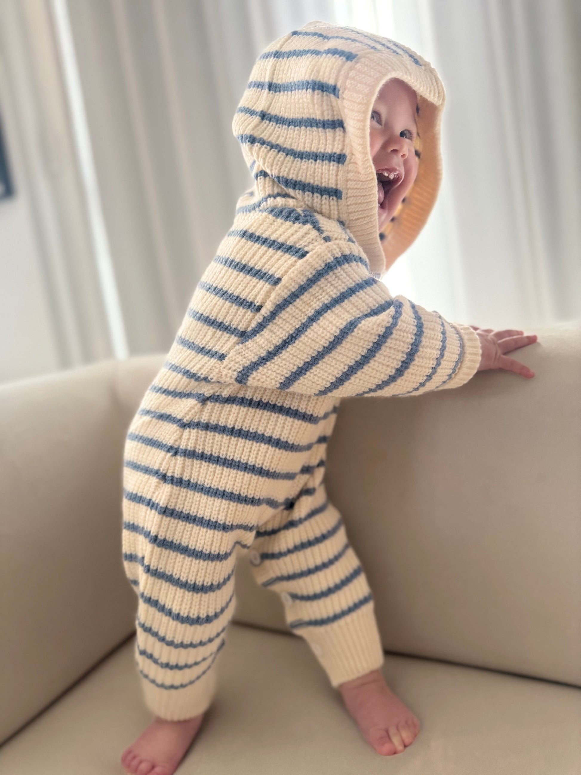 Inspired by breezy coastal days, our Seaside Stripe Romper features soft blue and white stripes. With a relaxed fit and cozy hood, it’s designed for comfort and style.